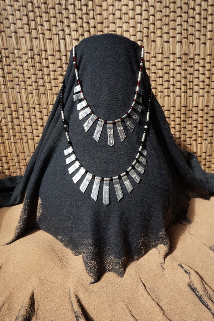 Zenebra zählen wie die chat chat zum traditionellen Schmuck der Tuareg-Frauen im Niger. Sie bestehen aus 13 fein ziselierten Blättchen mit roten oder schwarzen Glasperlen-Ketten.