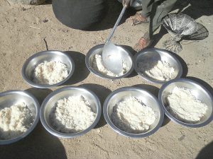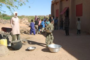Jeden Morgen vor dem Unterricht gibt es ein Frühstück aus Hirse mit Milch. Vor der Unterstützung durch IMARAN mussten sich die Kinder ihre eigene Milch in Flaschen von zu Hause mitnehmen. Jene Kinder, die keine Milch mitbekamen, gingen leer aus und mussten den Hirsebrei ohne Milch essen. Seit IMARAN dank Eurer Hilfe die Schule unterstützen kann, kommen alle Kinder in der Früh in den Genuß von Milch !