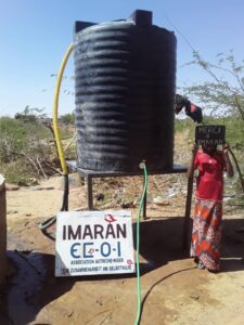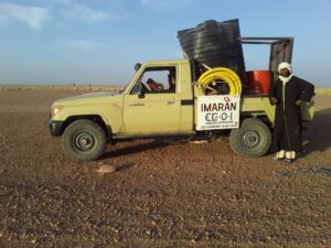 Bisher mussten die 95 Kinder der Schule von Intadeynawen mehrmals täglich ins Wadi (Trockenfluss) hinabsteigen und dort aus dem offenen Brunnen ihr Trink- und Waschwasser schöpfen. 2022 war es dann soweit. Mithilfe von Spendengeldern konnten wir ein 1.000 Liter-Fass von Arlit nach Intadeynawen liefern und den Wasserturm aufstellen.